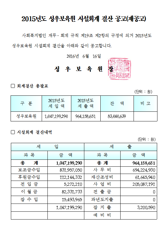 19-03-28 11:31 (재공고)2015년 시설회계 결산 페이지 정보 작성자 성우보육원 댓글 0건 조회 7,588회 본문 (재공고)2015년 시설회계 결산 목록 댓글목록 댓글목록 등록된 댓글이 없습니다.