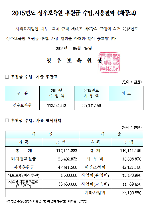 19-03-28 11:31 (재공고) 2015년 후원금 수입 및 지출명세서 페이지 정보 작성자 성우보육원 댓글 0건 조회 7,613회 본문 2015년 후원금 수입 및 지출명세서 목록 댓글목록 댓글목록 등록된 댓글이 없습니다.