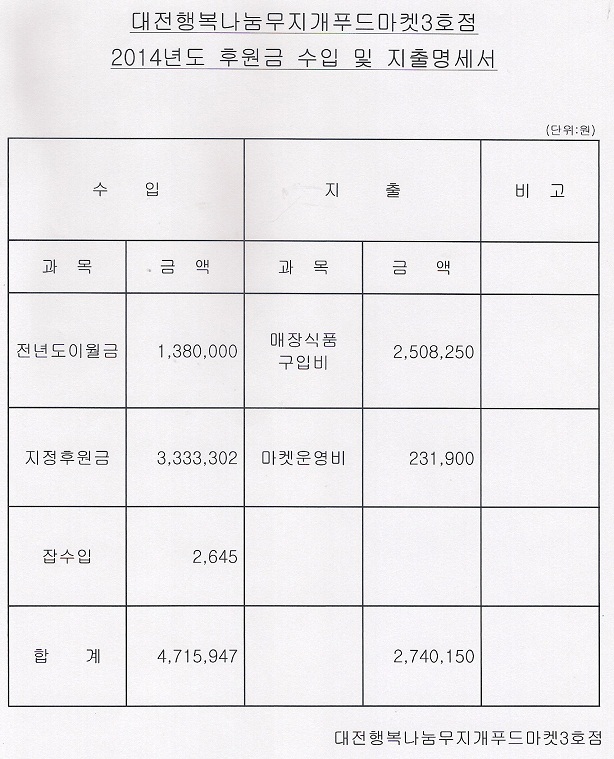 19-03-28 11:20 대전행복나눔무지개푸드마켓3호점 2014년도 후원금 수입 및 지출명세 공고 페이지 정보 작성자 성우보육원 댓글 0건 조회 7,526회 본문 대전행복나눔무지개푸드마켓3호점 2014년도 후원금 수입 및 지출명세 공고 목록 댓글목록 댓글목록 등록된 댓글이 없습니다.