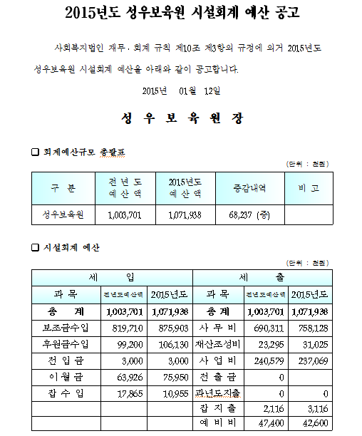 2015년 시설회계 예산 공고 작성일 19-03-28 11:04 페이지 정보 작성자성우보육원 조회 6,813회 댓글 0건 본문 2015년 시설회계 예산 공고 댓글목록 댓글목록 등록된 댓글이 없습니다.