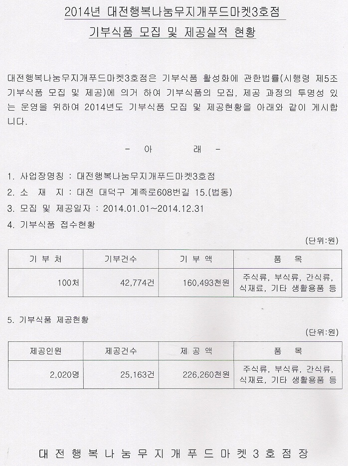 2014년도 대전행복나눔무지개푸드마켓3호점 기부식품 모집 및 제공실적 공고 작성일 19-03-28 11:04 페이지 정보 작성자성우보육원 조회 6,529회 댓글 0건 본문 2014년도 대전행복나눔무지개푸드마켓3호점 기부식품 모집 및 제공실적 공고 댓글목록 댓글목록 등록된 댓글이 없습니다.
