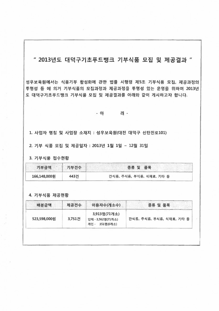 2013년 대덕구기초푸드뱅크 운영실적(기부식품 모집 및 제공결과) 작성일 19-03-28 11:00 페이지 정보 작성자성우보육원 조회 7,127회 댓글 0건 본문 2013년도 대덕구기초푸드뱅크 운영실적(기부식품 모집 및 제공결과)을 게시합니다. 댓글목록 댓글목록 등록된 댓글이 없습니다.