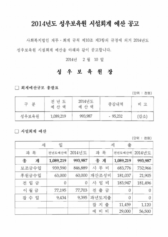<공고> 2014년 시설회계예산 작성일 19-03-28 10:59 페이지 정보 작성자성우보육원 조회 7,361회 댓글 0건 본문 <공고> 2014년 시설회계예산 댓글목록 댓글목록 등록된 댓글이 없습니다.