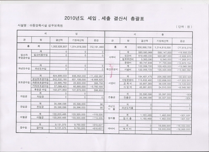 2010년도 세입세출 결산 총괄표 작성일 19-03-28 10:50 페이지 정보 작성자성우보육원 조회 7,308회 댓글 0건 본문 2010년 세입세출 결산 총괄표 댓글목록 댓글목록 등록된 댓글이 없습니다.