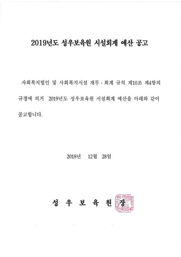 18-12-28 11:48 (공고) 2019년도 성우보육원 시설회계 예산 페이지 정보 작성자 성우보육원 댓글 0건 조회 7,753회 본문 2019년도 성우보육원 시설회계 예산 공고입니다. 목록 댓글목록 댓글목록 등록된 댓글이 없습니다.