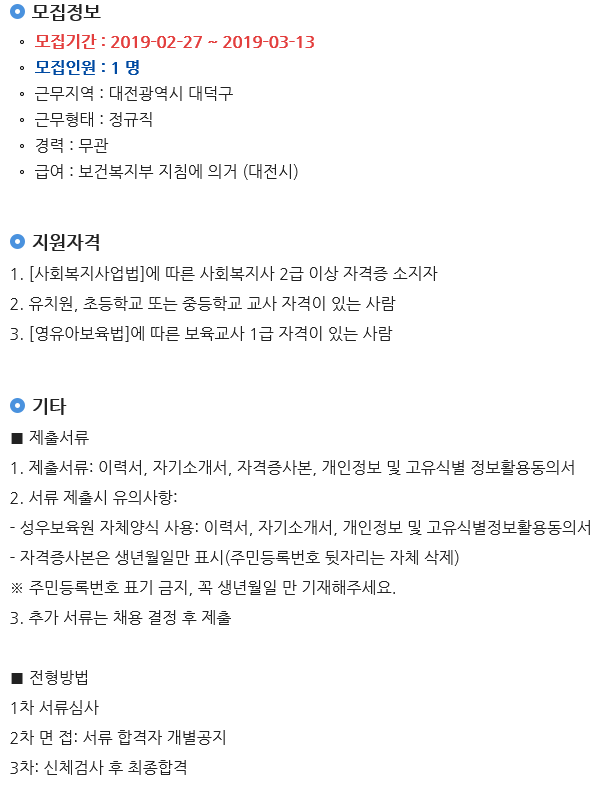 19-02-27 11:49 (공고) 생활지도원 모집 페이지 정보 작성자 성우보육원 댓글 0건 조회 7,716회 본문 생활지도원 모집관련, 복지넷 공고(공고번호: 493833)참고해주세요. 목록 댓글목록 댓글목록 등록된 댓글이 없습니다.