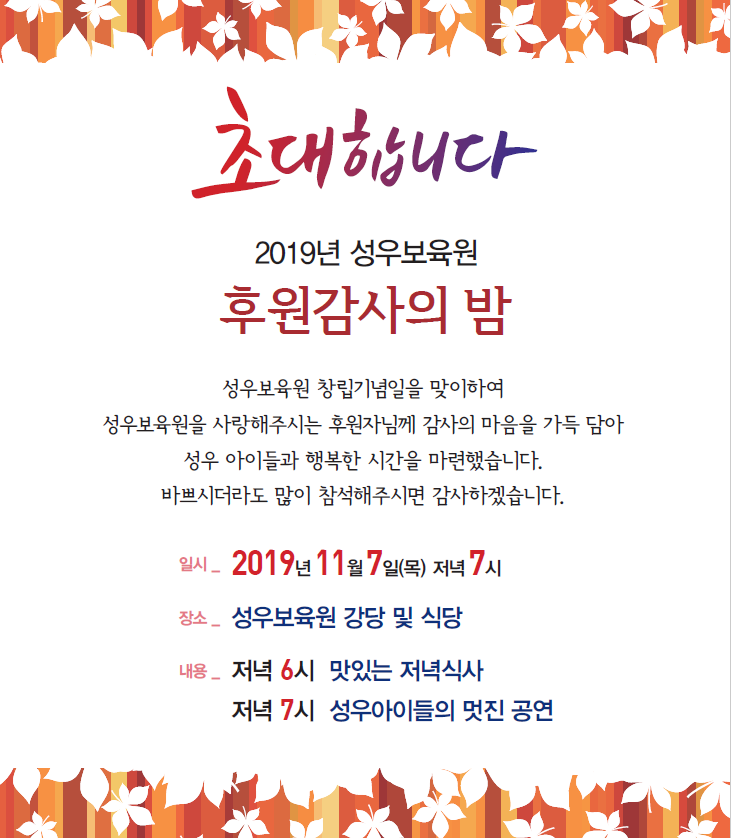 19-10-24 14:59 (초대합니다) 2019년 성우보육원 후원감사의 밤 (11월 7일 오후7시) 페이지 정보 작성자 성우보육원 댓글 0건 조회 7,272회 본문 2019년 성우보육원 후원감사의밤 많은 참석부탁드립니다! 목록 댓글목록 댓글목록 등록된 댓글이 없습니다.