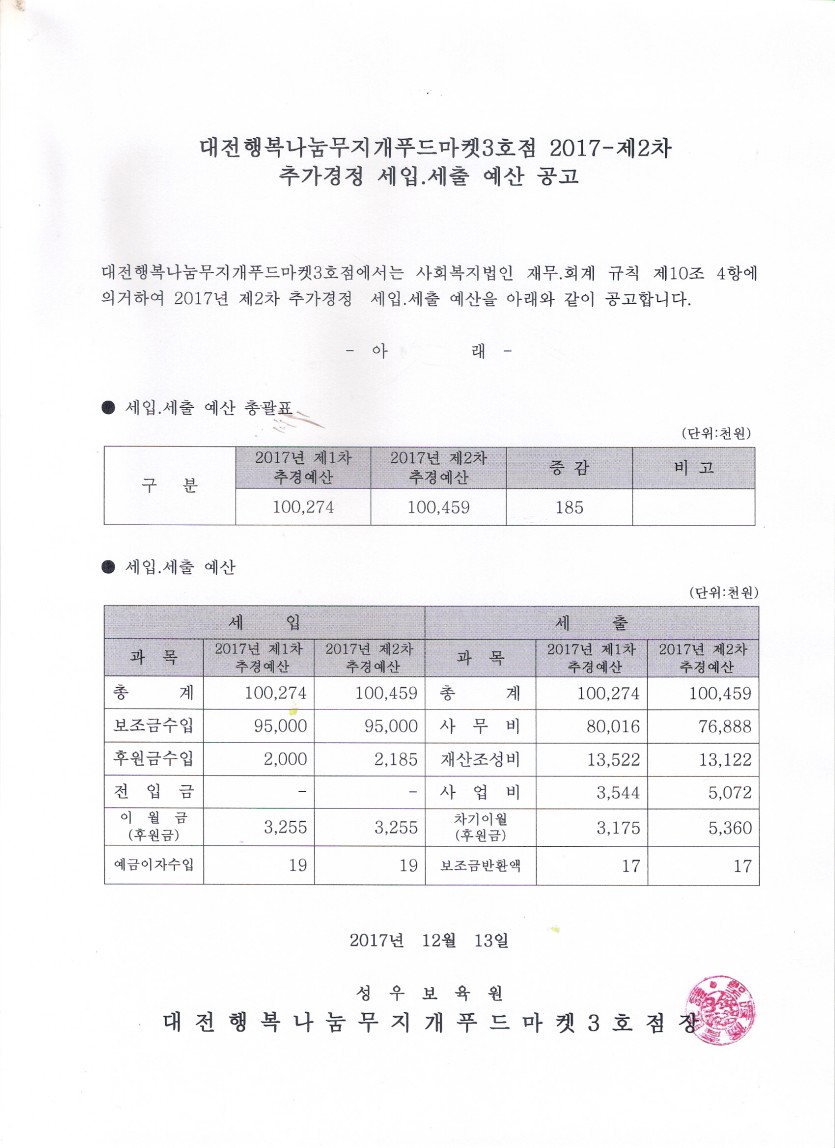 19-03-28 11:41 (공고)대전행복나눔무지개푸드마켓3호점 2017-2차 추가경정 세입.세출 예산공고 페이지 정보 작성자 성우보육원 댓글 0건 조회 7,717회 본문 (공고)대전행복나눔무지개푸드마켓3호점 2017-2차 추가경정 세입.세출 예산공고 목록 댓글목록 댓글목록 등록된 댓글이 없습니다.
