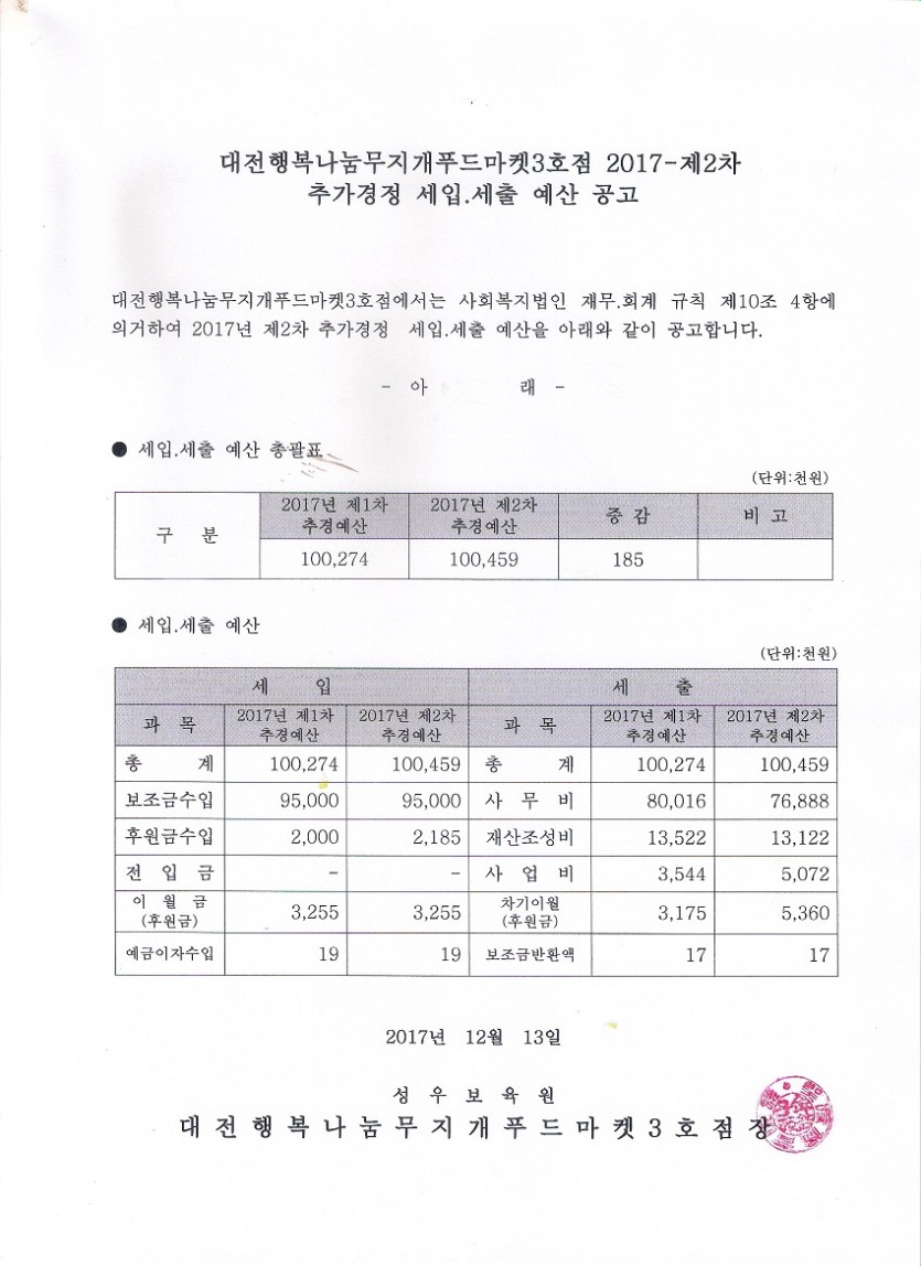 19-03-28 11:41 (재공고)대전행복나눔무지개푸드마켓3호점 2017-2차 세입.세출 추가경정 예산공고 페이지 정보 작성자 성우보육원 댓글 0건 조회 7,149회 본문 (재공고)대전행복나눔무지개푸드마켓3호점 2017-2차 세입.세출 추가경정 예산공고 목록 댓글목록 댓글목록 등록된 댓글이 없습니다.