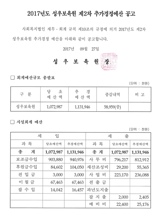19-03-28 11:40 (공고)2017년도 제2차 추가경정 예산 페이지 정보 작성자 성우보육원 댓글 0건 조회 7,450회 본문 2017년도 제2차 추가경정 예산 목록 댓글목록 댓글목록 등록된 댓글이 없습니다.