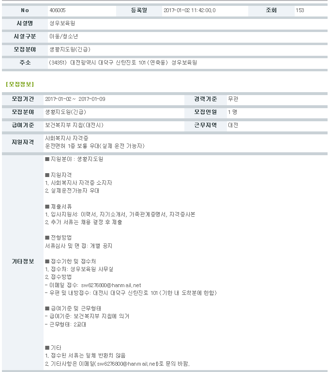 19-03-28 11:34 (공고) 생활지도원 모집 공고(긴급) 페이지 정보 작성자 성우보육원 댓글 0건 조회 7,447회 본문 (공고) 생활지도원 모집 공고(긴급) 목록 댓글목록 댓글목록 등록된 댓글이 없습니다.