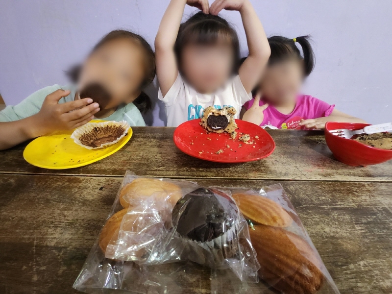 아이들이 간식을 먹으며, 퍼스트 아카데미 후원자 분들의 대해 사랑에 대해 감사함을 이야기하며,